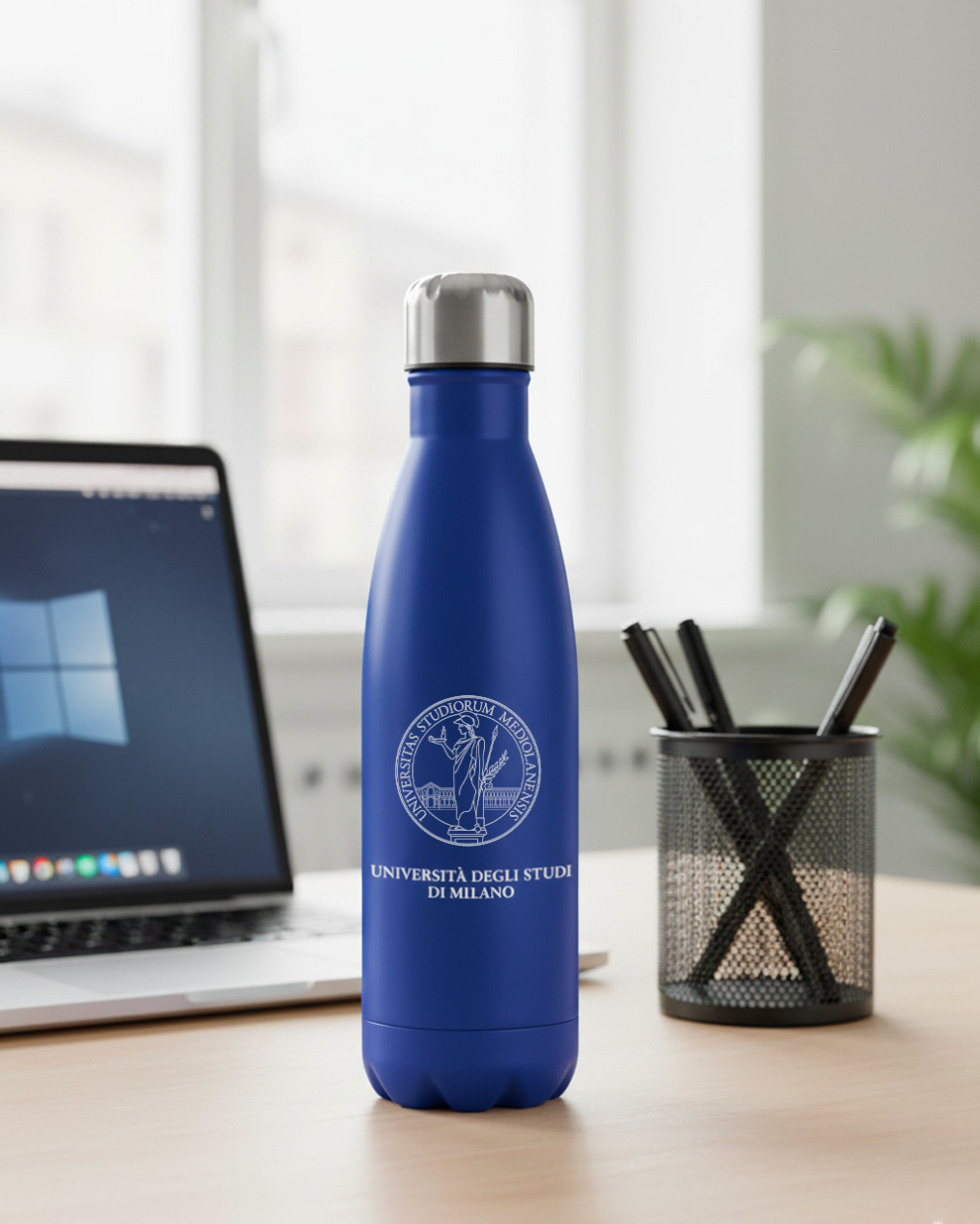 Double-layer thermal water bottle in Recycled Stainless Steel with a capacity of 550 ml, available in a range of colors with a metallic matte finish. Features a logo made of Recycled Stainless Steel. Individually packaged in a customized white box.